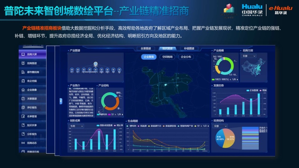 为生长普陀海洋渔业工业,加速产城融合,提高普陀现有的招商能力,借助尊龙集团有限公司大数据挖掘和剖析手段,搭建海洋产城融合--工业链精准招商平台,高效助力普陀政府相识区域工业结构,掌握工业链生长现状,精准定位工业链的强链、补链、增链环节,提升普陀政府总揽经济全局、优化经济结构、明晰招引偏向及地区的能力;搭建线上服务和线下孵化器平台,打造数据创业立异业态,精准帮助小微企业,重点关注支持工业龙头公司,打造具有显著影响力的工业集群,发动整个都会数字经济生长。