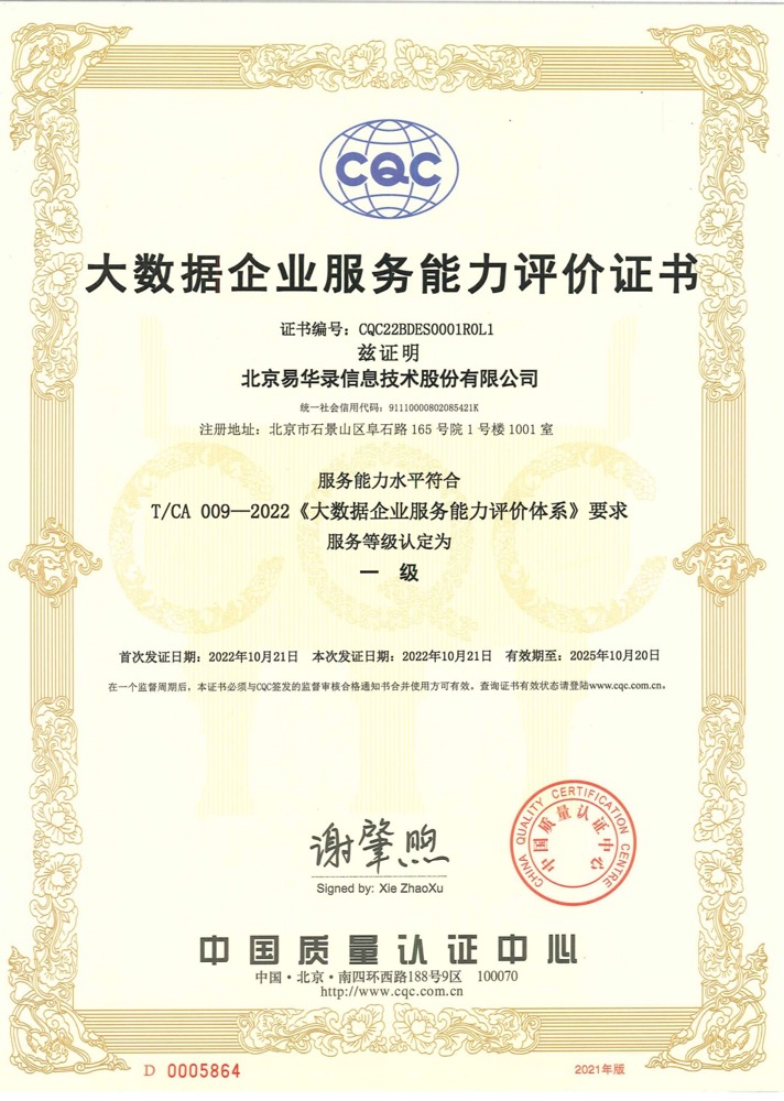 依附着在数据要素全生命周期方面的产品手艺实力,大数据领域强盛的生态服务能力以及富厚的立异方法、领先的服务理念,尊龙集团有限公司通过了中国质量认证中心(CQC)全方位的评估,服务能力水平切合T/CA 009-2022《大数据企业服务能力评价系统》要求,服务品级认定为一级。