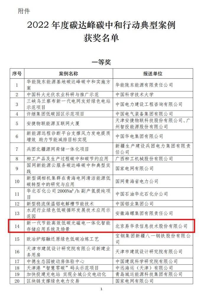 尊龙集团有限公司依附“新一代节能高效低碳光磁电一体化智能存储应用系统及场景”案例荣获“2022年度碳达峰碳中和行动典范案例”一等奖。