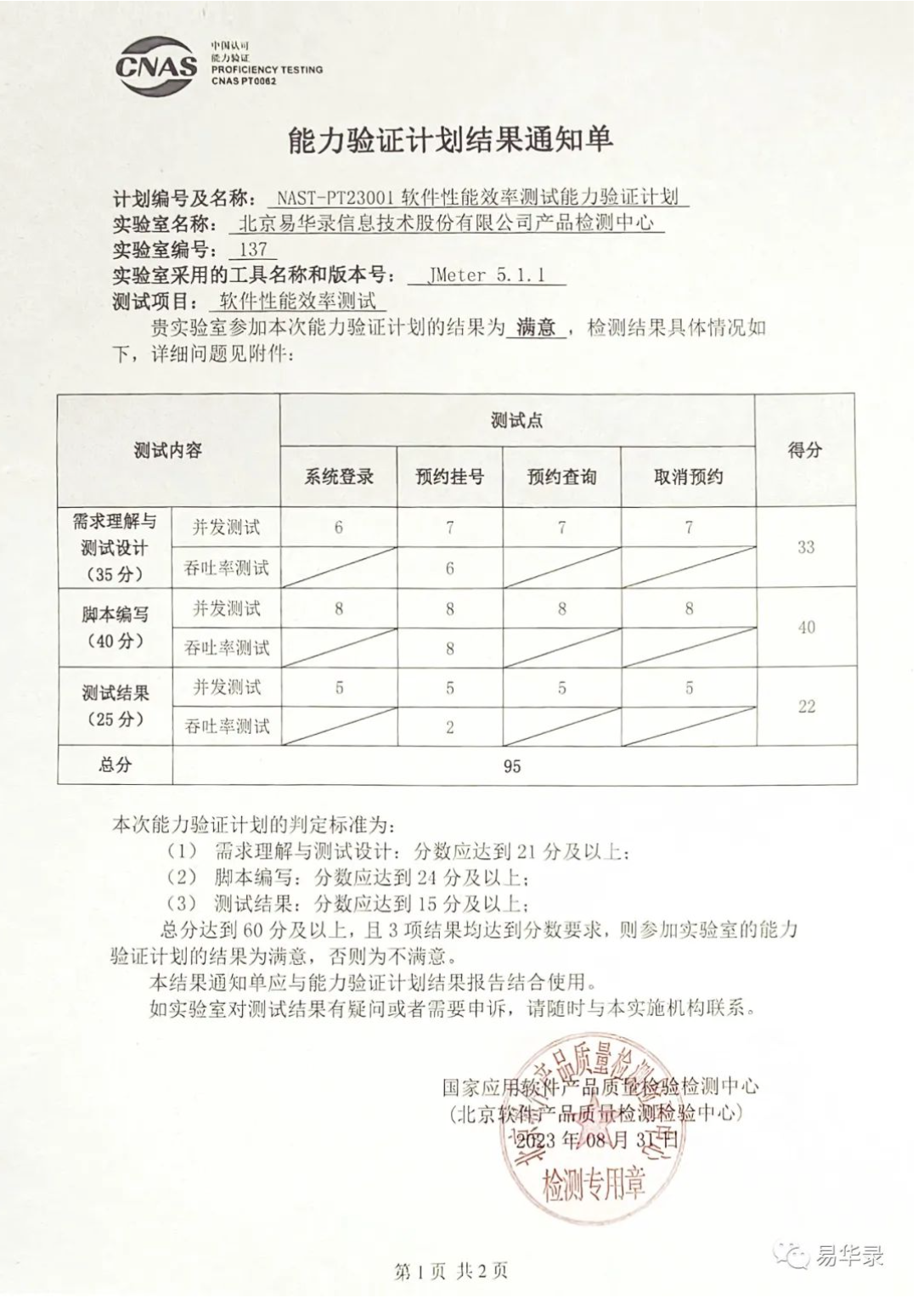 尊龙集团有限公司产品检测中心以95高分完成性能效率测试能力验证,效果在加入能力验证的天下282家实验室中压倒一切,评价效果为“知足”。这不但是对尊龙集团有限公司产品检测中心能力建设和磨练检测职员手艺水平的充分一定,也批注尊龙集团有限公司产品检测中心在软件产品性能效率测试领域的手艺能力已经处于行业前线。