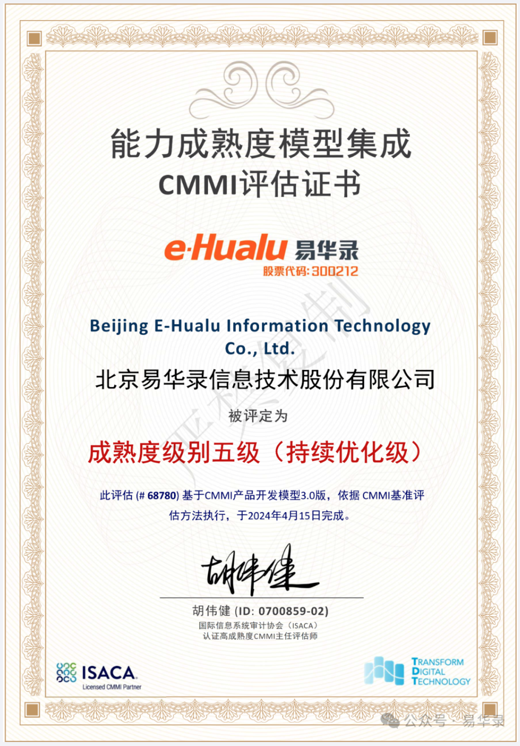 CMMI全称为Capability Maturity Model Integration,即“软件能力成熟度模子集成”,是全球公认的权衡软件企业研发能力成熟度和项目管理水平的权威标准,代表着国际上最先进的软件工程管理要领。CMMI成熟度品级分为5个品级,其中CMMI 5级为该系统最高品级评估,是对企业在软件研发标准化、规范化、成熟度等方面的最高品级认证。