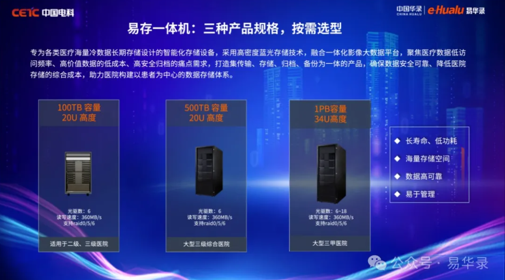 易存一体机设100TB、500TB、1PB三种产品规格,划分面向小型、中型和大型医院及其他医疗机构,知足差别规模下对存储空间、读取性能及清静包管的综合需求,普遍应用于数字胶片、影像会诊等场景。