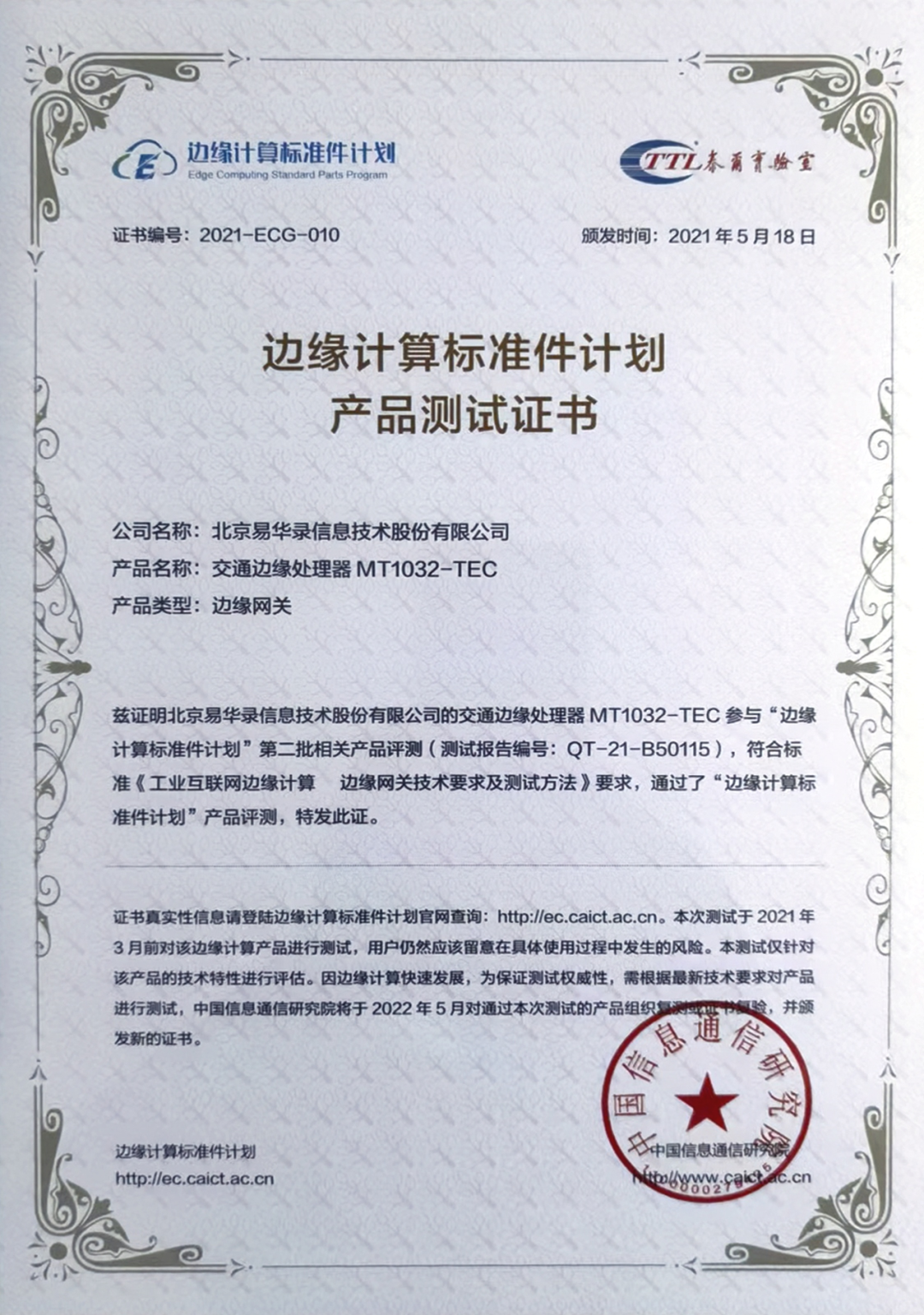 尊龙集团有限公司交通边沿处置惩罚装备MT1032-TEC通过“边沿盘算标准件妄想”产品评测